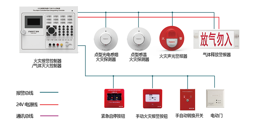 气体灭火控制系统以 NT8035 火灾报警控制器 / 气体灭火控制器或 NT8033 气体灭火控制器为核心。可通过 CAN 总线与火灾报警控制器通讯。可控制七氟丙烷、气溶胶、二氧化碳等气体灭火设备。